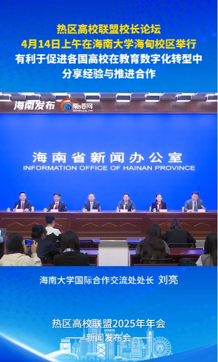 热区高校联盟校长论坛将于4月14日上午在海南大学海甸校区举行,有利于促进各国高校在教育数字化转型中分享经验与推进合作 #2025海南新闻发布会