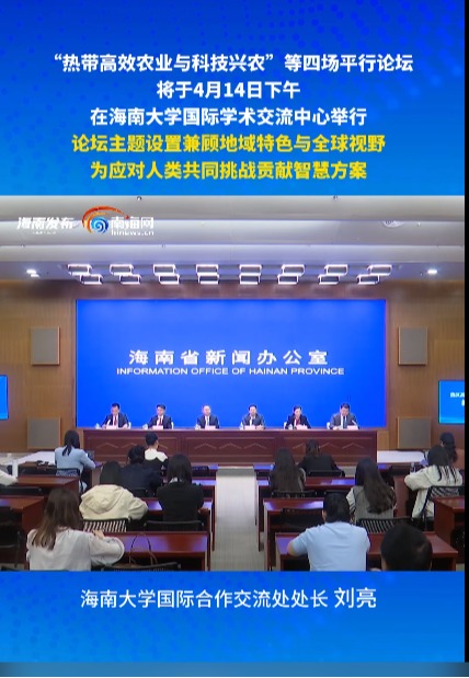 “热带高效农业与科技兴农”等四场平行论坛将于4月14日下午在海南大学国际学术交流中心举行,论坛主题设置兼顾地域特色与全球视野,为应对人类共同挑战贡献智慧方案 #2025海南新闻发布会