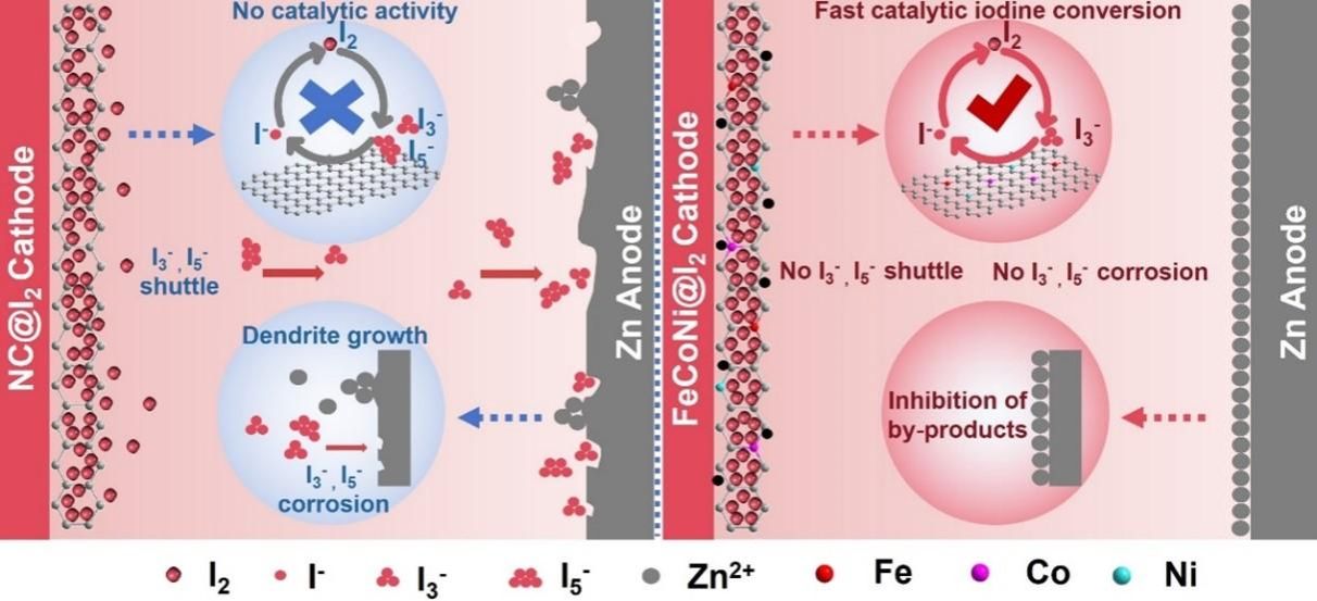 《中国科学报》(记者 温才妃 李思颖 梁淑仪)海南大学海洋科学与工程学院副教授邢振月、史晓东和教授田新龙团队研究发现,将铁钴镍原子掺杂多孔碳催化剂作为功能载体材料可以推动水系锌碘电池循环稳定工作。12月19日,相关研究成果发表在《先进功能材料》上。铁钴镍原子掺杂多孔碳催化剂作为功能载体材料的作用机制示意图。课题组供图水系锌碘电池因其高安全性、高能量密度、低成本和环保属性而受到广泛关注。然而,活性碘溶解和多碘化物穿梭是阻碍水系锌碘电池应用的两大障碍。...