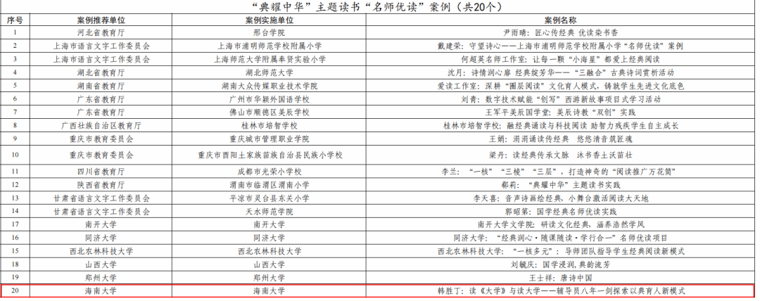 本站讯(记者 郑润泽)近日,国家语委办公室公布了2024年“典耀中华”主题读书行动创新实践案例名单,海南大学报送的“韩胜丁:读《大学》与读大学——辅导员八年一剑,探索以典育人新模式”案例入选“典耀中华”主题读书“名师优读”案例,是海南省唯一入选的案例。2024年“典耀中华”主题读书“名师优读”案例名单。据悉,“典耀中华”主题读书行动是国家语委深入贯彻落实党的二十大精神,学习贯彻习近平文化思想,加快建设教育强国,...