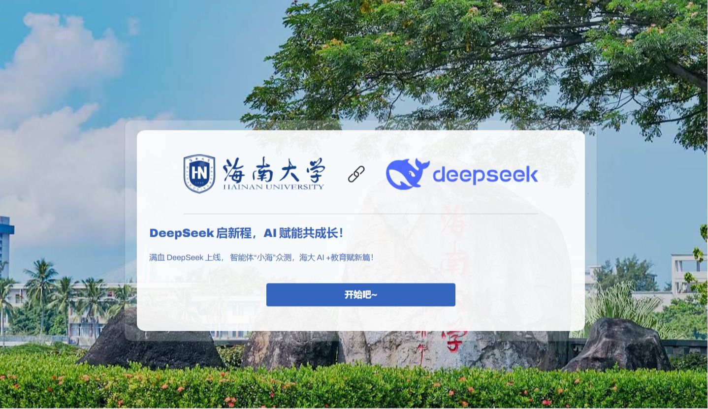 本站讯(记者 梁淑仪)近日,海南大学正式上线自主研发的校园智能体“小海”众测版(以下简称“小海”),并本地化部署满血版DeepSeek-R1,以人工智能技术赋能教育教学、科研管理与校园服务,致力于为校园师生提供高效、稳定的本地化人工智能服务。“小海”智能体登录界面“小海”之名,寓意深刻,“海”是“HAI”的音译,也是 “H + AI”的组合,“H”代表海南大学,“AI”是人工智能。象征着海南大学与人工智能技术的深度融合,寓意小海将依托海南大学的学术资源与科研力量,...