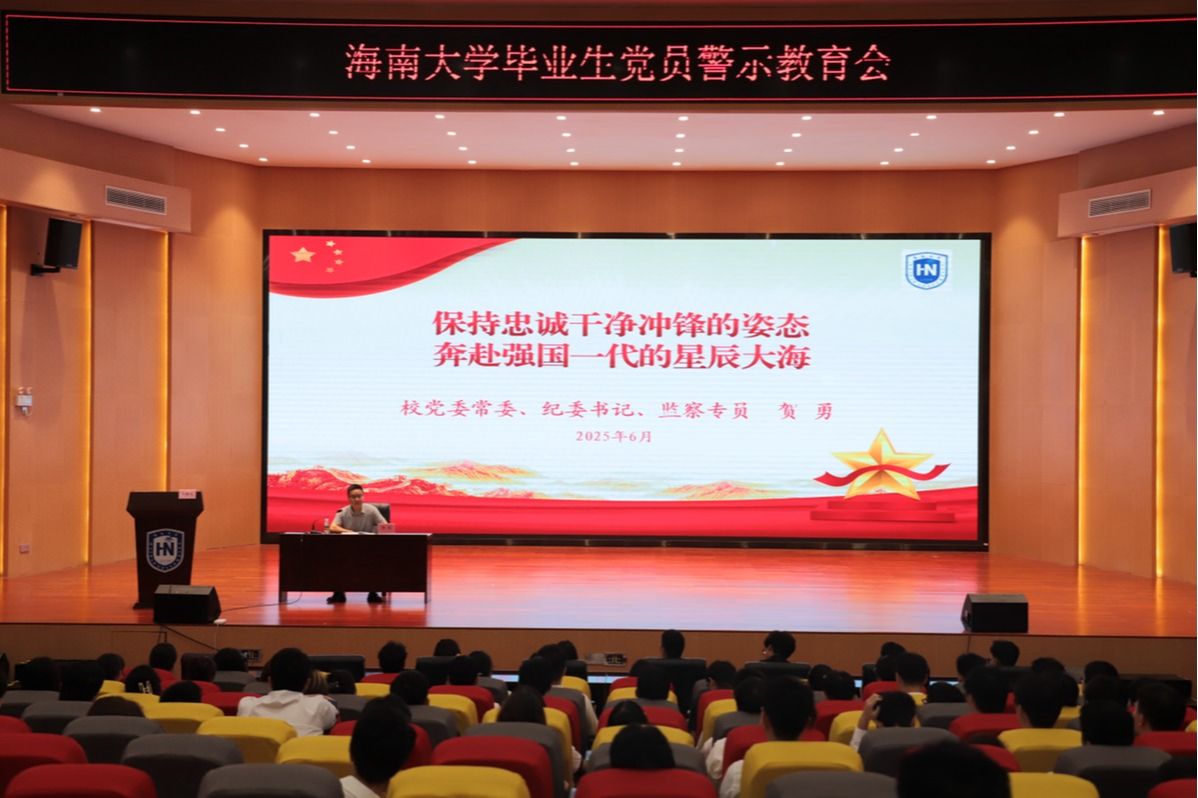(中国日报社海南记者站 陈博文 | 张阳、陈思甜、冯梦凡)6月13日下午,海南大学毕业生党员警示教育会在田家炳楼二楼报告厅举行。校纪委书记贺勇作专题辅导报告。贺勇通过剖析典型案例、强化警示教育,引导全体毕业生党员以案为鉴、警钟长鸣,切实增强自身廉洁自律意识,夯实拒腐防变的思想根基,确保在即将走入社会、迈上新的人生阶段之际,扣好廉洁从业的“第一粒扣子”。贺勇指出,要常怀忠诚之心、敬畏之心、进取之心与仁爱之心,...