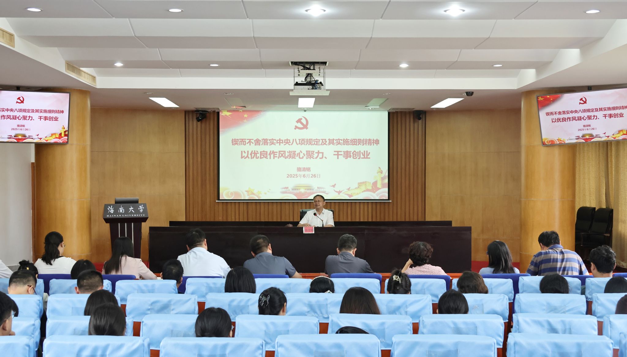 本站讯(记者 郑润泽 邰茜)6月26日上午,海南大学党委副书记、校长骆清铭在办公楼一楼报告厅以《锲而不舍落实中央八项规定及其实施细则精神 以优良作风凝心聚力、干事创业》为题讲授专题党课。6月26日上午,骆清铭在办公楼一楼报告厅讲授专题党课。邱采奕 摄骆清铭指出,要认真学习领会习近平总书记关于加强党的作风建设的重要论述,深入贯彻落实中央八项规定及其实施细则精神,系统学习党的十八大以来深入贯彻中央八项规定精神的成效和经验,...