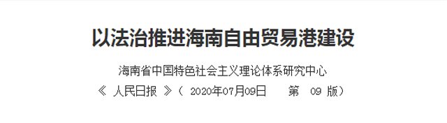 《人民日报》2020年7月9日理论版刊登了海南省中国特色社会主义理论体系研究中心研究员,海南大学法学院教授、博士生导师常健理论文章《以法治推进海南自由贸易港建设》。全文如下:以法治推进海南自由贸易港建设支持海南逐步探索、稳步推进中国特色自由贸易港建设,分步骤、分阶段建立自由贸易港政策和制度体系,是习近平总书记亲自谋划、亲自部署、亲自推动的改革开放重大举措。习近平总书记强调:“要以制度创新为核心,赋予...