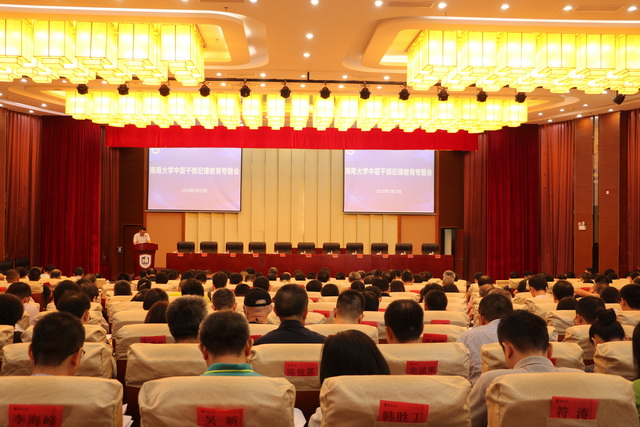本站讯(记者\摄影张文沛)7月19日上午,海南大学中层干部纪律教育专题会暨暑期工作部署会在社科楼二楼报告厅举行。校党委书记武耀廷,校长骆清铭,党委常务副书记廖清林,纪委书记、省监察委员会驻海南大学监察专员郑尉杰,副校长傅国华,党委常委、副校长胡新文、陈险峰、王崇敏、梁谋,党委常委、组织部部长韩淑梅,党委常委、统战部部长陈明宝出席会议。会议由骆清铭、廖清林分别主持。 武耀廷讲话 武耀廷指出,2020年是海...