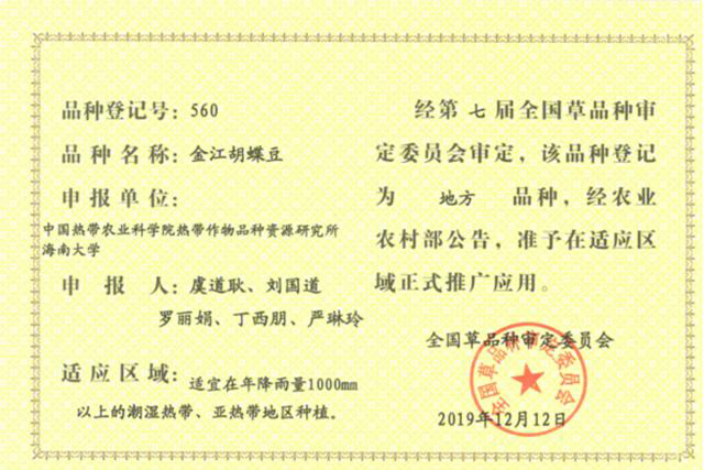近期,海南大学热带作物学院罗丽娟教授团队参与选育的两个豆科热带牧草品种通过全国草品种审定委员会审定。其中“热研24号圭亚那柱花草”( 品种登记号564)为育成品种,“金江蝴蝶豆”(品种登记号560)为地方品种。这两种豆科牧草品种具有高产、优质、抗性强等优良特性,在我国华南地区有着良好的推广应用前景