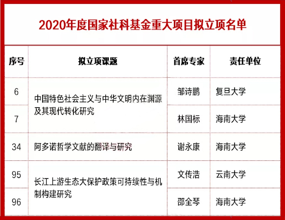 本站讯(记者 张赫)11月19日,全国哲学社会科学工作办公室发布了《2020年度国家社科基金重大项目立项名单公示》。此次公示的名单中共有342项,责任单位涉及131个教学和研究机构。海南大学拟立项3项,位列第27名。国家社科基金项目是目前学术界公认的我国哲学社会科学领域层次最高、权威性最强的研究项目。就高校而言,其立项数量直接反映整体科研能力、学术水平和发展潜力,也是学科评估、学术评价、大学排名的重要指标之一。...
