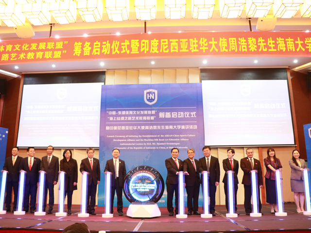 本站讯(记者/摄影 余梦月 王梦洋)11月24日上午,“中国-东盟体育文化发展联盟”“海上丝绸之路艺术教育联盟”筹备启动仪式暨印度尼西亚驻华大使演讲活动在海南大学社科楼二楼报告厅举行。印度尼西亚共和国驻华大使周浩黎夫妇;中国—东盟中心秘书长陈德海;中国科学院院士、海南大学校长骆清铭,党委常委、副校长梁谋、叶光亮出席启动仪式。叶光亮主持仪式。 武耀廷与印度尼西亚驻华大使周浩黎互赠纪念品 武耀廷与中国-东盟中...