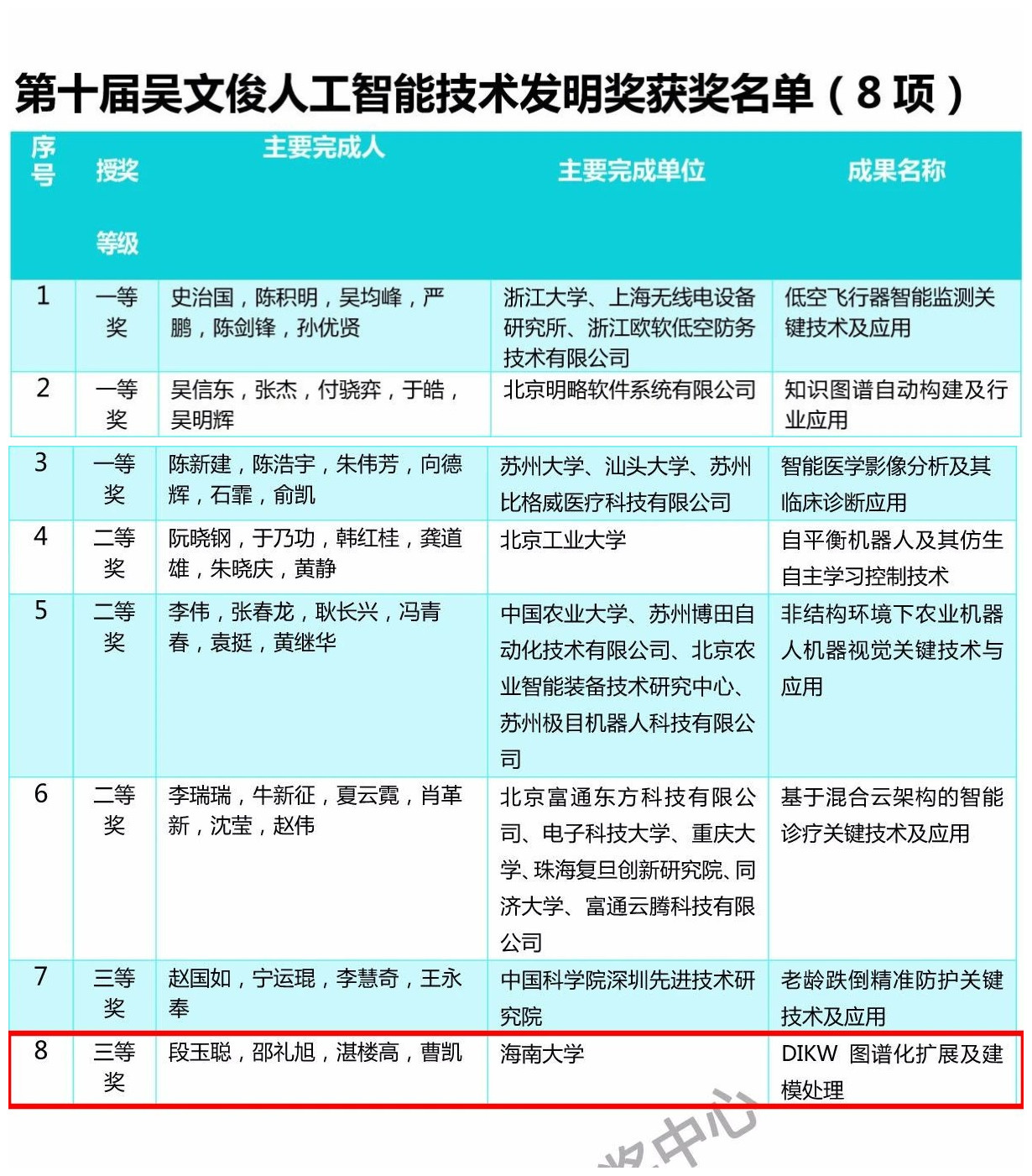 本站讯(记者 蔡盼盼)日前,2020年度第十届吴文俊人工智能科学技术奖获奖名单公示。海南大学段玉聪教授团队DIKW图谱化扩展及建模处理项目研究成果荣获吴文俊人工智能技术发明三等奖。“吴文俊人工智能科学技术奖”是依托社会力量设立的科学技术奖,具备提名推荐国家科学技术奖资格,被誉为“中国智能科学技术最高奖”,代表人工智能领域的最高荣誉象征。根据《吴文俊人工智能科学技术奖励条例》和《吴文俊人工智能科学技术奖励...