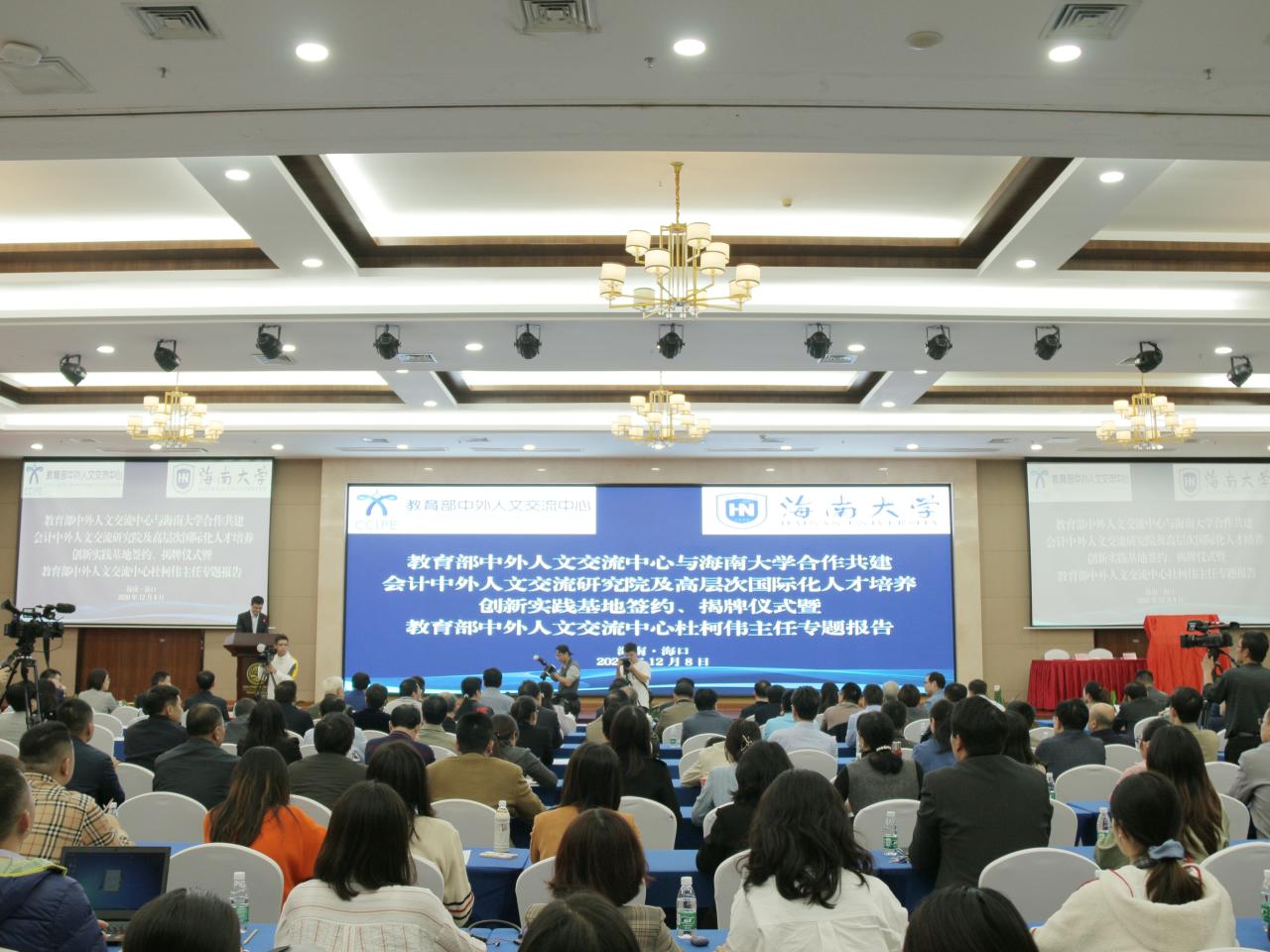 本站讯(记者 张赫 摄影 张赫 江心慧)12月8日下午,教育部中外人文交流中心与海南大学在国际学术交流中心签署协议,合作共建“会计中外人文交流研究院”,并举行“会计中外人文交流研究院”“高层次国际化人才培养创新实践基地” 揭牌仪式。教育部中外人文交流中心主任杜柯伟;海南大学党委书记武耀廷,中国科学院院士、校长骆清铭,党委常委、副校长叶光亮,党委常委、组织部部长韩淑梅出席仪式。叶光亮主持仪式。杜柯伟致辞...
