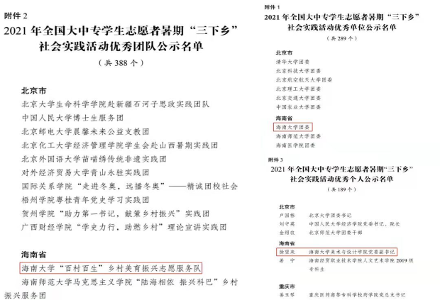 本站讯(记者 许劲草 通讯员 徐望来)近日,由中央宣传部、中央文明办、教育部、共青团中央、全国学联共同举办的2021 年全国大中专学生暑期“三下乡”社会实践活动结果通报中,海南大学荣获“优秀单位”奖,“百村百生”乡村美育振兴志愿服务队获评“优秀团队”奖,美术与设计学院党委副书记徐望来获评“优秀个人”奖。值得一提的是,我校已连续六年获得“优秀单位称号”,该评选结果通过基层申报、省级团委审核推荐、组织评议...