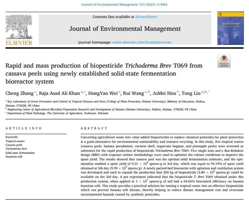 本站讯(记者 李天畅)近日,海南大学植物保护学院刘铜教授团队利用热带农业废弃物生产木霉孢子粉,实现了从实验室优化到规模化生产和应用。该研究在木霉菌固体发酵方面取得了重要进展。木霉菌(Trichoderma. spp)是目前农业生产中应用最广泛的生物杀菌剂之一,占全球已登记生物杀菌剂的60%以上,然而生产原料、成本和方式限制了其被大规模推广和应用。农业生产过程存在较多可用作固体发酵原料的农业废弃物,这些农业废弃物通...