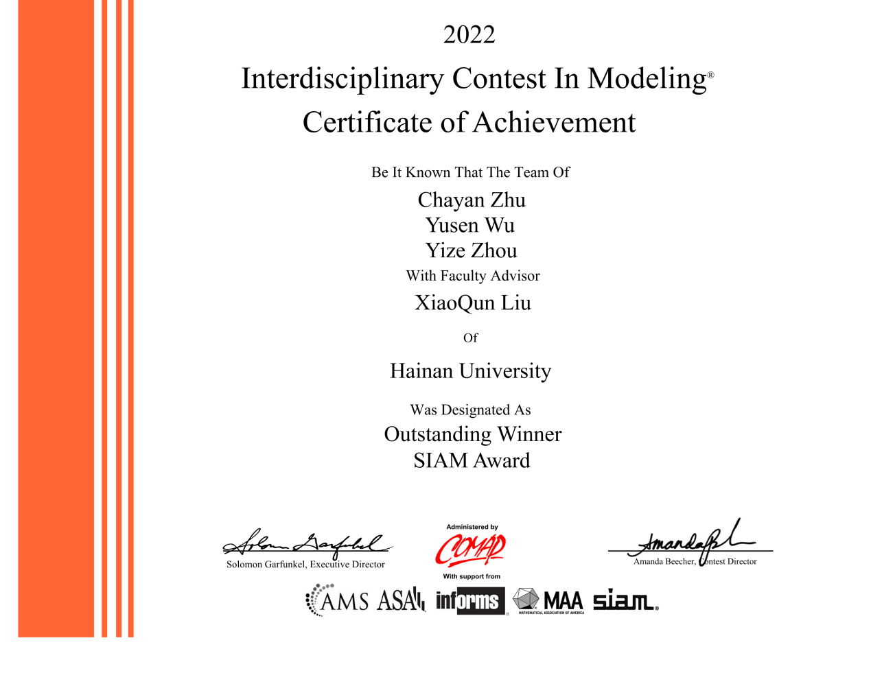 本站讯(记者 解闪灵 董澄和)5月6日,第38届美国国际大学生数学建模竞赛与交叉学科建模竞赛成绩公布,海南大学理学院2018级信息与计算科学专业周燚泽、经济学院2019级国际经济与贸易文科实验班朱姹嫣和吴宇森团队斩获特等奖(Outstanding Winner),并同时问鼎了美国工业与应用数学学会奖(SIAM Award,简称SIAM奖)。此外,海南大学应用科技学院2020级电子科学与技术专业卫浩然、赵婷婷、谢裕莹团队获一等奖,理学院2020级数...