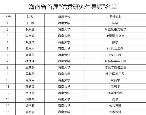 本站讯(记者 王博)近日,海南省首届“优秀研究生导师”和“优秀研究生导师团队”评选结果揭晓。海南大学共有15人获评“优秀研究生导师”,7个集体荣获“优秀研究生导师团队”称号。据悉,海南大学高度重视研究生导师队伍建设,坚持以创新能力、育人成效为导向,狠抓研究生导师业务能力提升,严格落实研究生导师立德树人职责,助推海南省研究生导师队伍高质量发展。(编辑:王一钦