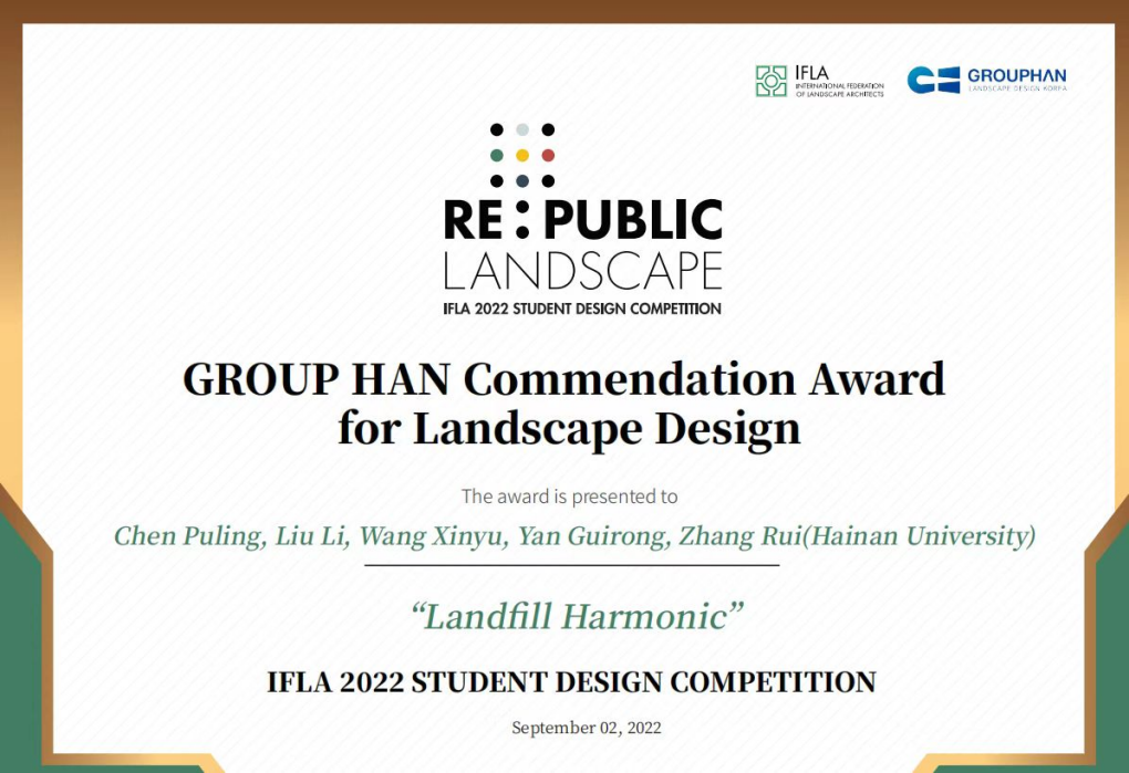本站讯(记者 周超烨 通讯员 梁怀月)近日,第58届国际风景园林师联合会(IFLA)世界大会在韩国光州举办。海南大学林学院2021级风景园林学研究生陈璞玲、刘丽、王新禹、闫桂荣、张瑞设计的作品“Landfill Harmonic”(填埋场的和旋)获得国际学生竞赛景观设计类别二等奖,该作品由许先升、杨定海、赵书彬、刘拥春等教师指导。该作品立足于南美洲亚松森巴拉圭河流域Cateura垃圾填埋场所带来的复杂生态社会经济问题,拟将原本的垃...