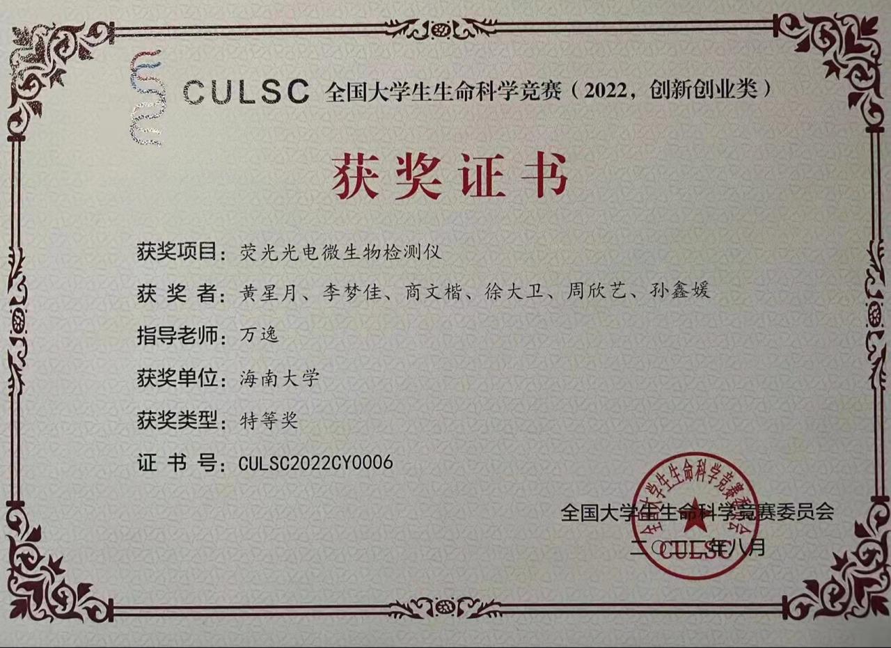 本站讯(记者 刘清怡 通讯员 商文楷)近日,2022年全国大学生生命科学竞赛(创新创业类)决赛落下帷幕。由来自海南大学海洋学院、管理学院和信息与通信工程学院的黄星月、李梦佳、商文楷等同学组成的荧光光电微生物检测仪项目团队荣获特等奖,实现了海南大学在全国大学生生命科学竞赛的新突破。该项目由万逸教授指导。海南大学荧光光电微生物检测仪项目团队获国家级特等奖。该项目面向微生物快检行业,利用酶生物传感、基因探针...