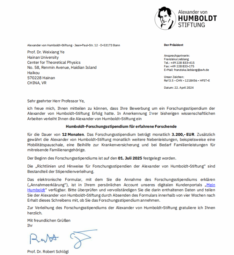 本站讯(记者 康静)近日,海南大学物理与光电工程学院教授叶巍翔获得2024年德国洪堡基金会“洪堡资深学者”研究基金资助。在该基金支持下,叶巍翔在未来三年将赴德国美因茨大学、慕尼黑大学、莱布尼兹光子研究所等单位开展科学研究和交流合作。正式通知函。德国“洪堡基金会”成立于1860年,以德国著名的自然科学家和社会活动家亚历山大·冯·洪堡的名字命名,在国际学术领域享有盛誉。洪堡基金会主要在世界范围内为优秀年轻学者和科学家提供资助,...