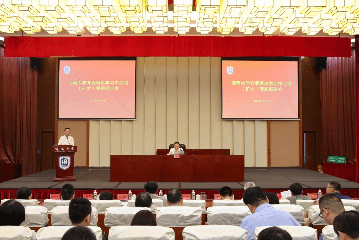 本站讯(记者 郑润泽 廖丹丹)4月23日下午,海南大学党委理论学习中心组(扩大)专题报告会在社科楼二楼报告厅召开,会议围绕“扎实开展党纪学习教育,纵深推进全面从严治党,为加快建设综合性研究型国际化‘双一流’大学提供坚强纪律保障”主题开展专题学习。教育部党建工作联络员谭基虎;校党委书记符宣国,党委常委和校领导高佃恭、聂清斌、邱锡光、贺勇、陈骏、韩淑梅、谭勇出席会议。会议由符宣国主持。会议现场。廖丹丹 摄海南省纪委常委冷葆青作了题为《...