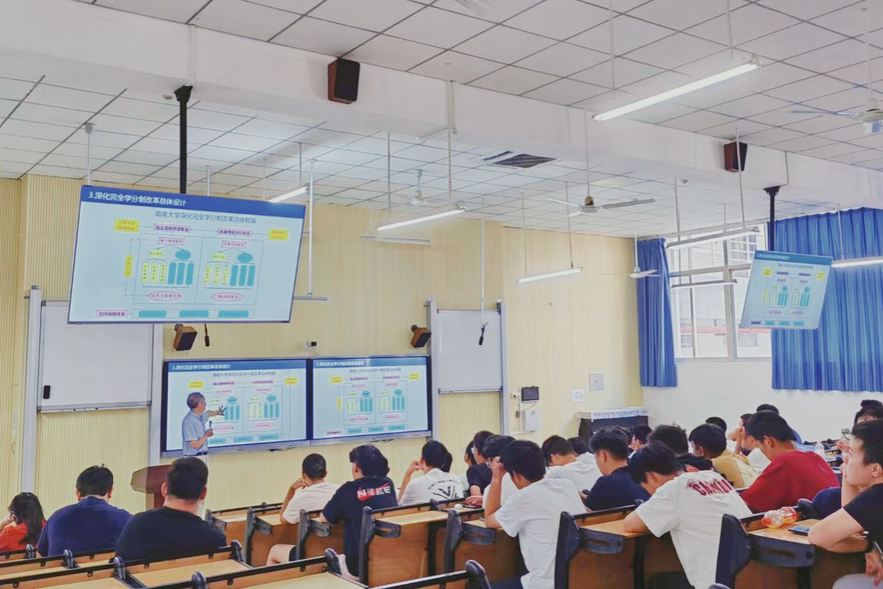 本站讯(通讯员 余力力)9月26日下午,海南大学深化完全学分制改革政策解读交流会首场活动在5教111教室举行。教务处处长王志刚、副处长赵银梅,子衿书院党委书记李海朋,教务处教材科科长余力力,子衿书院2024级辅导员李健,以及子衿书院2024级新同学代表100余人参加了交流。王志刚进行政策介绍。余力力 摄现场问答交流。余力力 摄王志刚处长就学校深化完全学分制改革的制度设计、具体配套政策进行了介绍和深入解读,并围绕同学们现场提出的自主选择专业、...