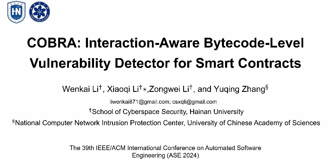 国际顶级学术会议ASE(IEEE/ACM International Conference on Automated Software Engineering)在10月27日起在美国加州萨克拉门托召开。我院博士研究生李文凯(第一作者)、副教授李晓琦(通讯作者)、特聘教授张玉清、硕士生李宗维在ASE上发表长篇Regular Research论文“COBRA: Interaction-Aware Bytecode-Level Vulnerability Detector for Smart Contracts”。ASE属于CCF A类学术会议,是软件工程研究领域的国际顶级学术会议。...