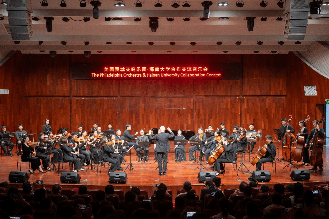 本站讯(记者 朱思宇)11月9日上午,美国费城交响乐团·海南大学合作交流音乐会在海南大学音乐厅举行。费城交响乐团及费城金梅尔艺术中心总裁兼首席执行马思艺先生,海南大学党委常委、副校长陈骏出席交流音乐会。 在座无虚席的交流音乐会现场,费城交响乐团与海南大学交响乐团同台演出,用音符交流情感、以音乐沟通心灵——费城交响乐团带来了《节日行板》、《坎佐那之音》、《圆号奏鸣曲》、《亨德尔在斯特兰德街》等曲目,海南大学交响乐团演奏了《九钟传奇》,两个乐团还合奏了海南民歌《万泉河水》。音乐厅内,金声玉振、乐声悠扬,掌声连绵。 在谈及与费城交响乐团的合作感悟时,海南大学交响乐团中提琴演奏家、海南大学教师陈彦方讲述:“两个乐团共同演奏的曲目《万泉河水》作为海南民歌,四位费城交响乐团成员的加入让音乐的诠释以及音色的控制上,有了新的特色。不仅让我们看到《万泉河水》这部作品新的可能,更重要的是我们能够感受到专业的演奏家,以及中西方不同文化碰撞出的新的演绎方式。” 费城交响乐团相关负责人;海南大学相关单位、部门负责人及师生代表观看交流音乐会。