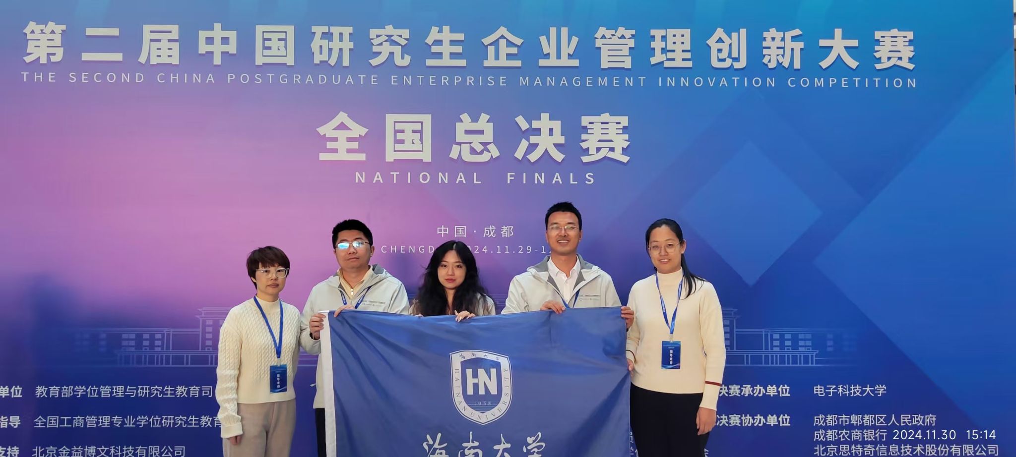海南大学MBA代表队。 本站讯(通讯员 戚晓慧)2024年11月30日,第二届中国研究生企业管理创新大赛全国总决赛在成都科幻馆盛大启幕。海南大学MBA代表队再获全国一等奖。本届大赛分为企业决策赛道和商业分析与智能应用赛道两个赛道,共吸引来自298所高校的14433人次的研究生参赛。经过初赛、复赛的激烈角逐,共有来自139所院校的210支队伍晋级全国总决赛。在海南大学MBA教育中心学术主任郭琦老师的带领及管科系巩玲君老师的指导下,...
