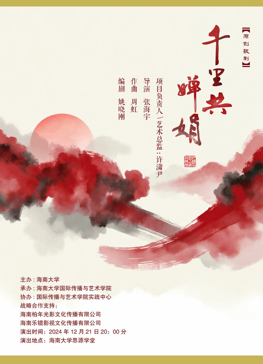 12月14日,《千里共婵娟》原创歌剧新闻发布会,在海南大学思源学堂多功能厅举行。该项目负责人、艺术总监、国家一级演员、海南大学国际传播与艺术学院音乐表演责任教授许潇尹在发布会上介绍,该剧以北宋大文豪苏东坡的生平事迹为蓝本,分为序幕、“欲把西湖比西子”、“随风飘千里”、“西北望,射天狼”及“海南万里真吾乡”等篇章,以全新的视角、沉浸式艺术表演的形态,倾情呈现东坡先生爱知己、爱家国、爱天地的赤子情怀。为确保原创性、...