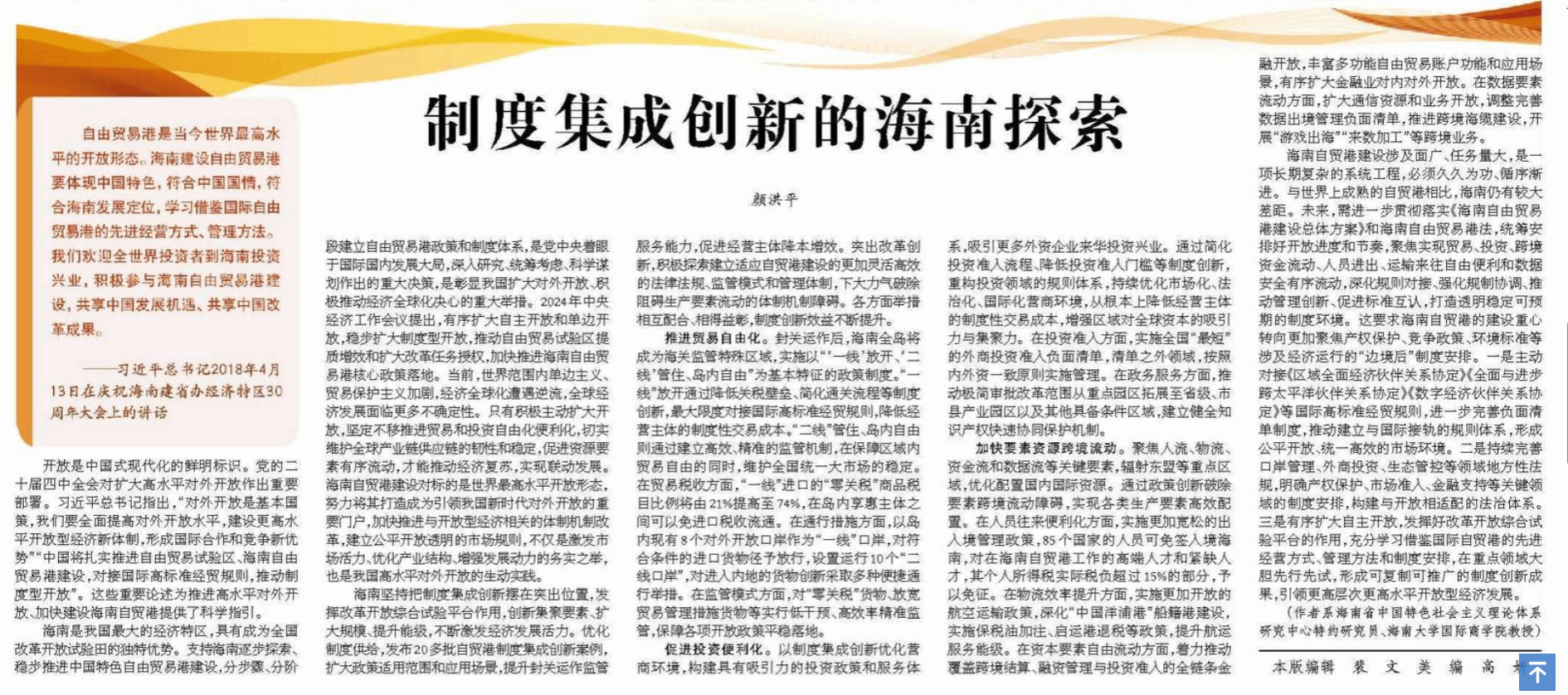 本站讯(通讯员 陈艺靖)2025年10月28日,海南大学国际商学院颜洪平教授的理论文章《制度集成创新的海南探索》在《经济日报》理论版重磅发表。该文立足海南自贸港建设实践,系统阐释制度型开放的“海南路径”,为我国高水平对外开放提供了重要理论参考。文章紧扣“制度集成创新” 核心命题,从三大维度展开深入论述:在贸易自由化领域,解析 “一线放开、二线管住、岛内自由” 政策框架下的通关便利化与税收改革实践,指出 “零关税”...