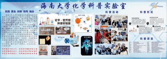 海南大学化学科普基地成立于2023年1月,现设有“海Na未来”化学科普实验室,为“开放实验室+科普基地”功能融合性实验室,基地依托化学化工学院基础化学实验教学中心开放实验室,位于海南大学基础实验楼4楼、5楼,占地面积约160 m2,2023年12月认定为海南省科普基地。科普基地面向社会开放,以服务社会为己任,激发各年龄段学生的科学兴趣,培养化学探究与创新能力,拓展高等院校的社会服务功能。科普基地包含“缤纷世界”实物展示、“神奇化学”动手体验、“高科技与生活”讲解、视频教学、科普主题展板六部分,同时科普基地开设系列化学科普讲座、系列趣味化学实验及化学探究课题,开展化学科普开放日、化学DIY、化学科普进校园等活动。共同探索富有海大化学特色大科普教育新模式,多渠道、多维度推动科普服务高质量发展,增强科学文化软实力。“海Na未来化学科普实验室”在海南大学儋州校区和海甸校区参与“全国科普日”活动多次,面向社会实现每月一次“科普开放日”活动,服务人数超3000人次。