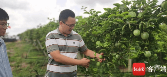 房传营副教授带着两名学生在果园内查看挂果情况。黝黑的脸庞、身穿防晒衣的海南大学农艺与种业专业的硕士研究生倪世豪和王露在地里熟练地做着农活,一点也不像象牙塔内的高校生。