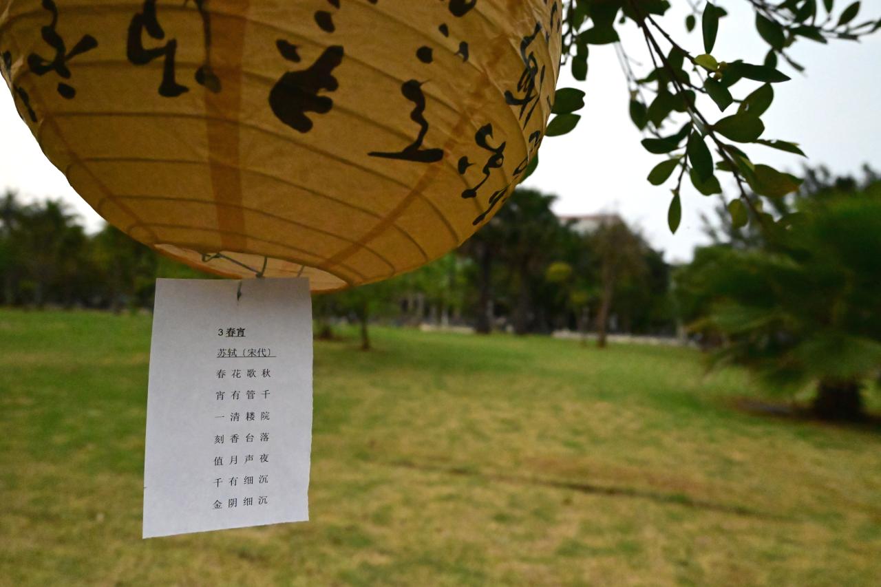 天容海色,云散月明,树上缀满灯笼。灯笼精巧,缀以苏轼、李白、杜甫等各路大家诗词,与君共赏。灯影绰绰,诗词飘飘,万千诗情也尽在其中了。