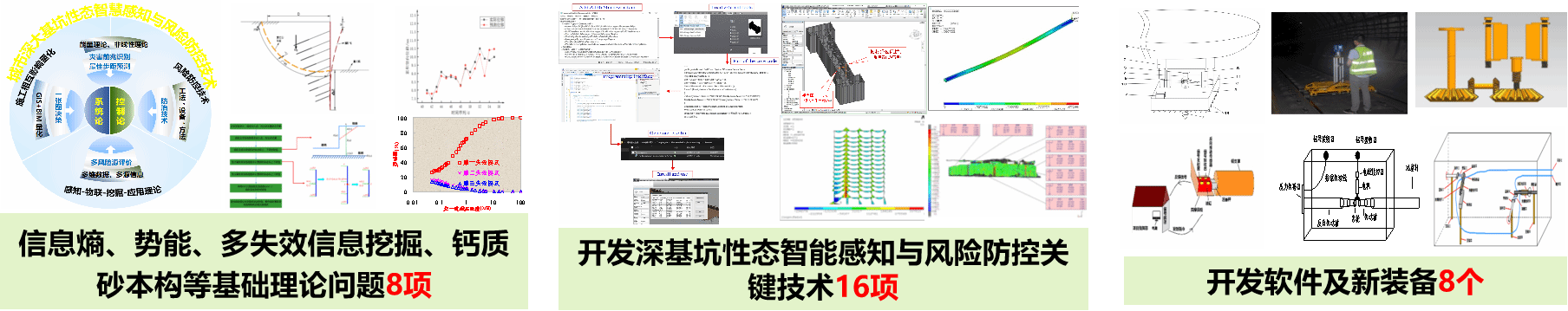 针对复杂环境下滨海城市深大基坑施工过程中的灾害前兆识别和风险防控技术,经过产学研合作研究,创建了深基坑施工信息感知-物联-挖掘-应用配套技术、复杂周围环境施工期相互影响实时多源信息GIS+BIM量化一张图决策方法,开发了BIM深大基坑围护体系风险识别软件和相关装备。