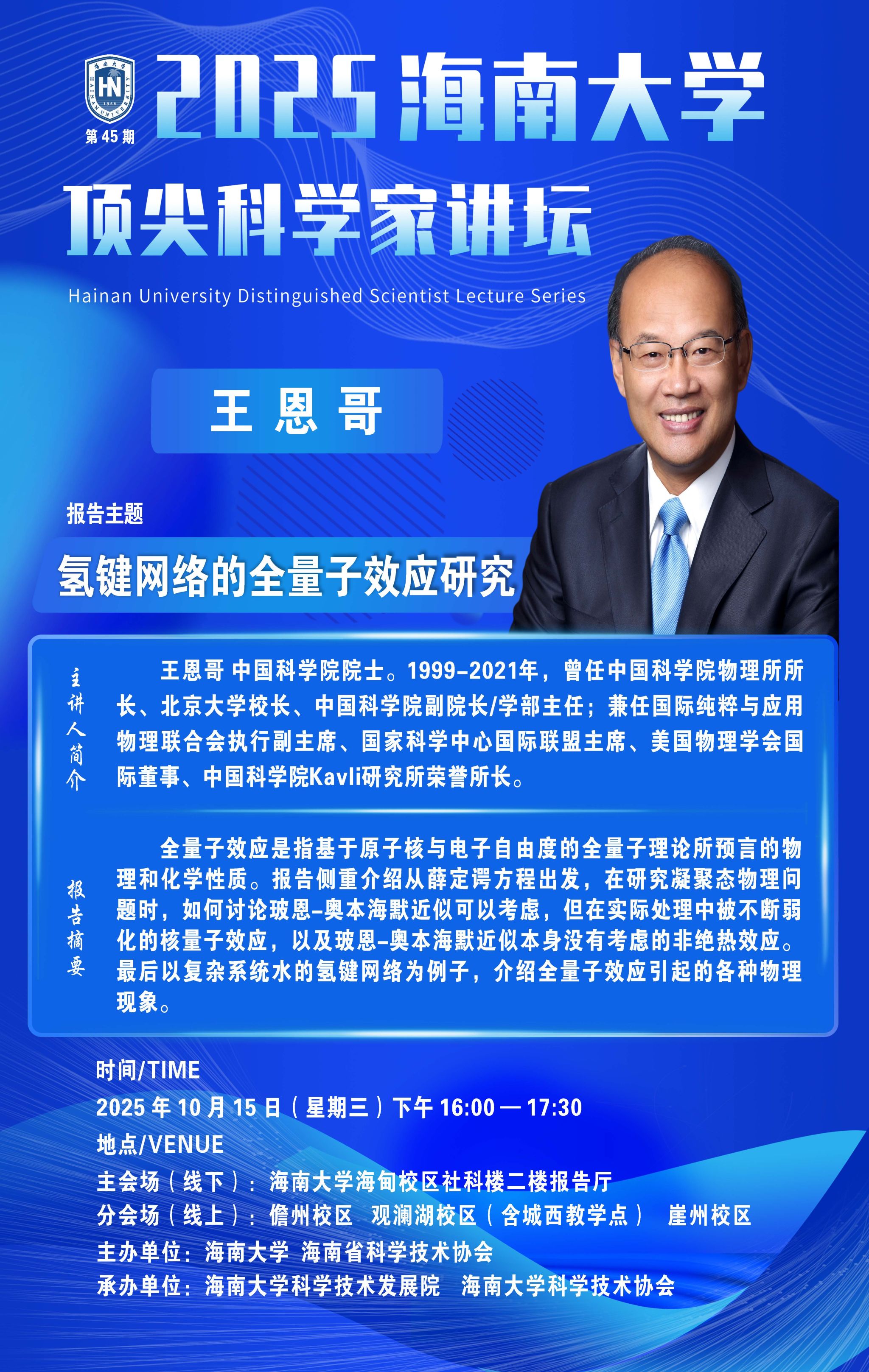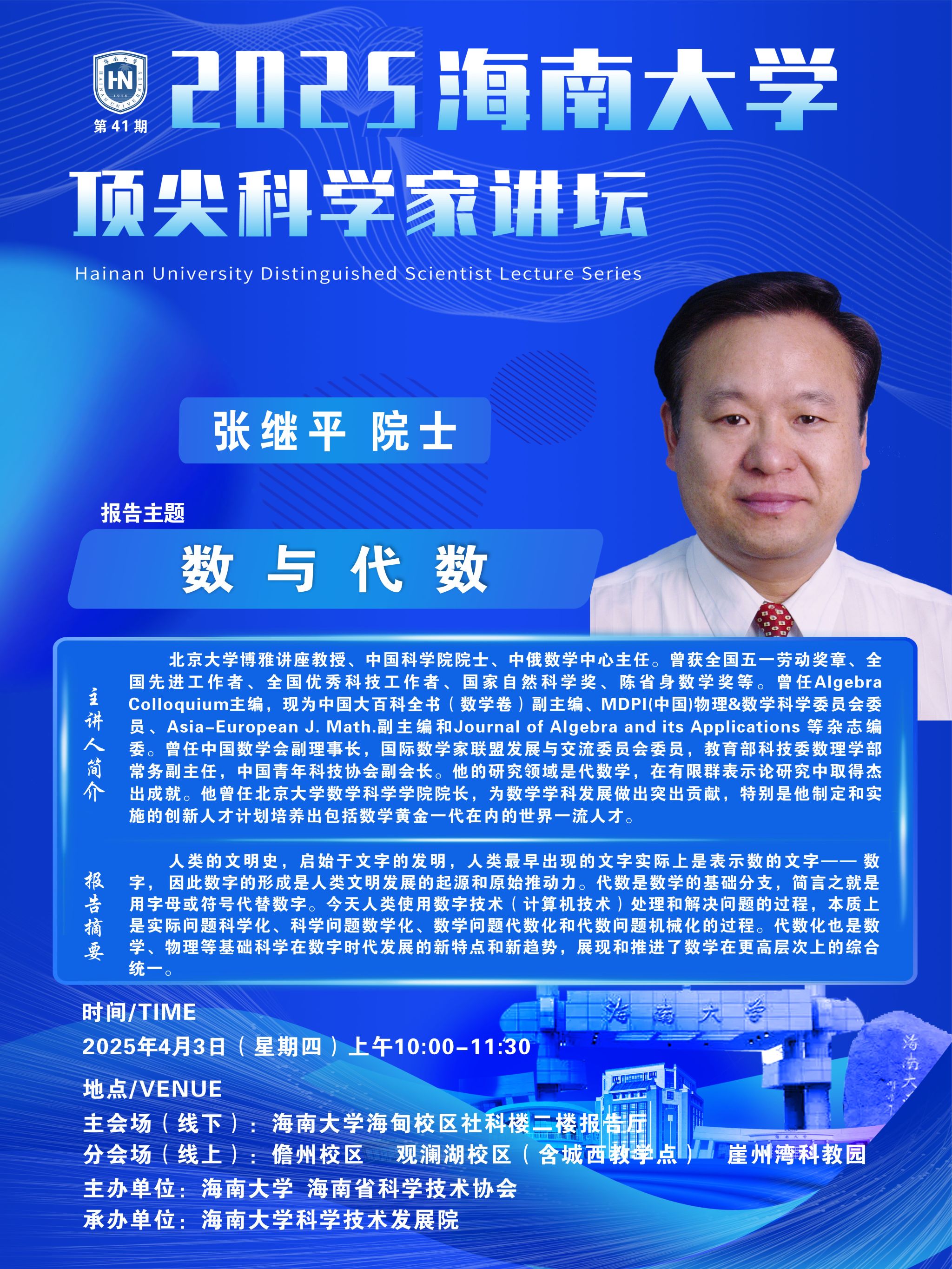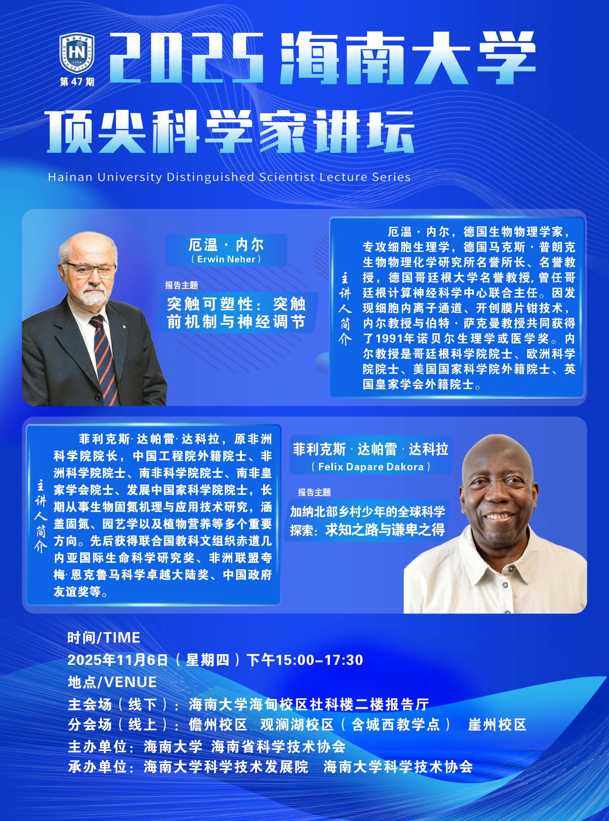 “海南大学顶尖科学家讲坛”致力于开拓学校师生的国际学术视野,增加师生与世界学术大师近距离接触的机会,聆听各学科领域最前沿的声音,促进相关学科国际交流与建设,培养师生的家国情怀、科学兴趣和创新思维,为学校与国际学术界搭建交流的桥梁。
