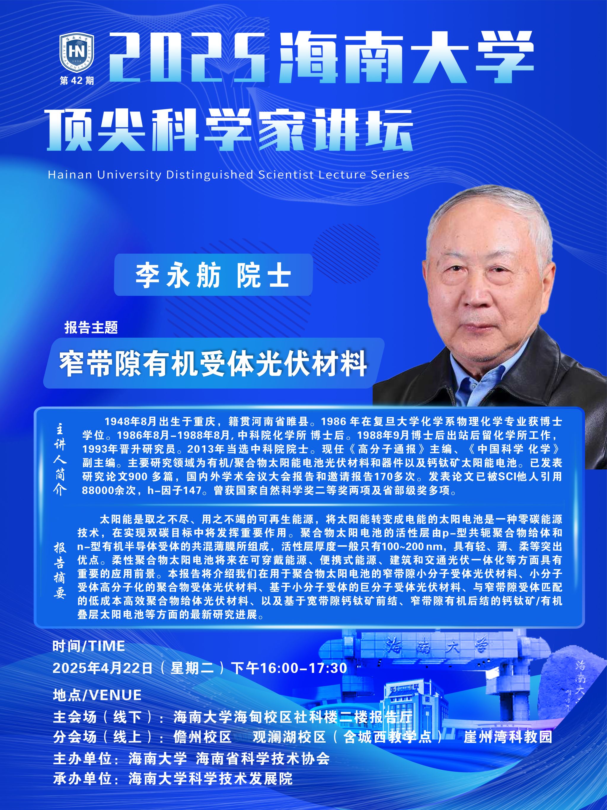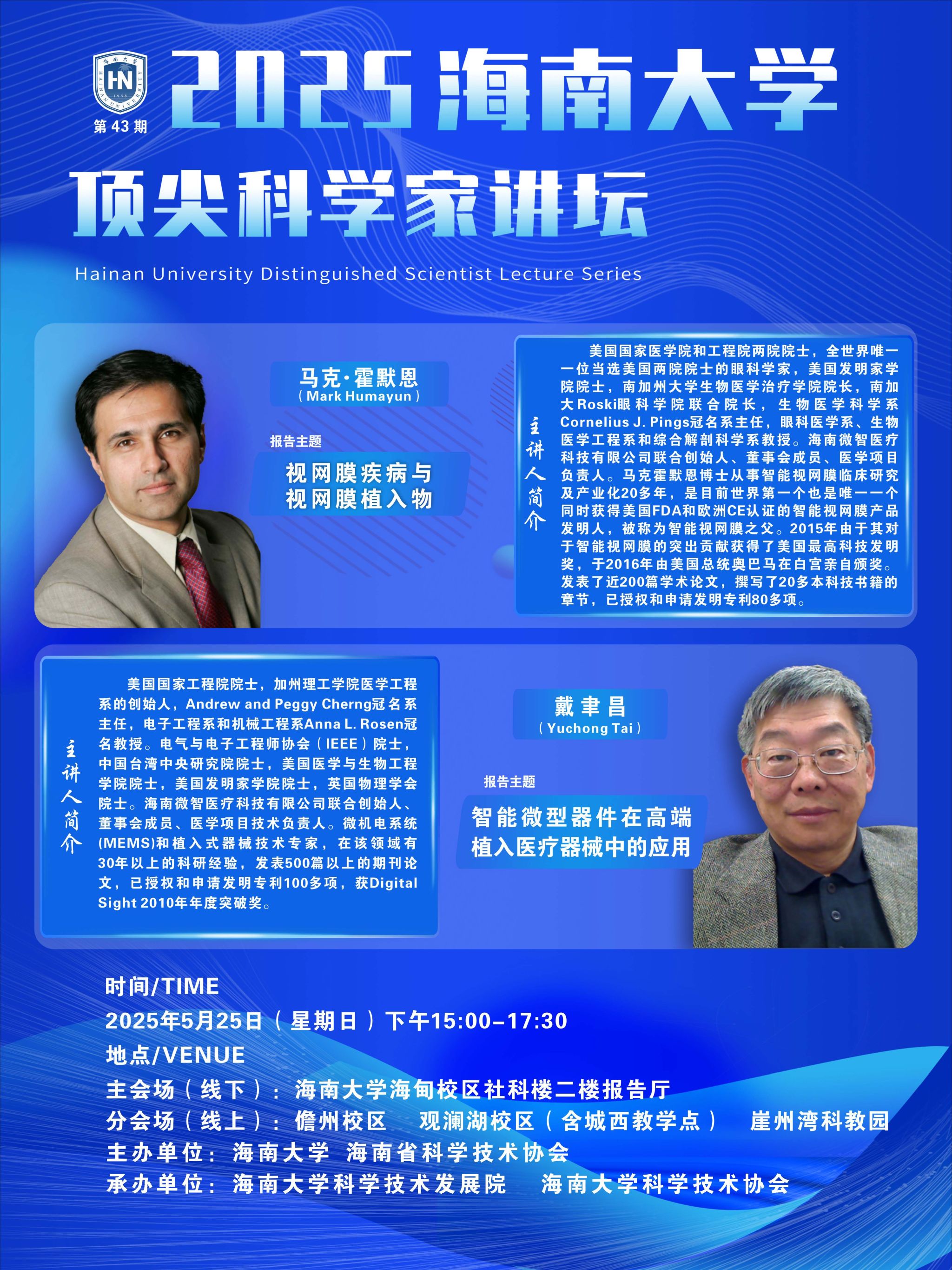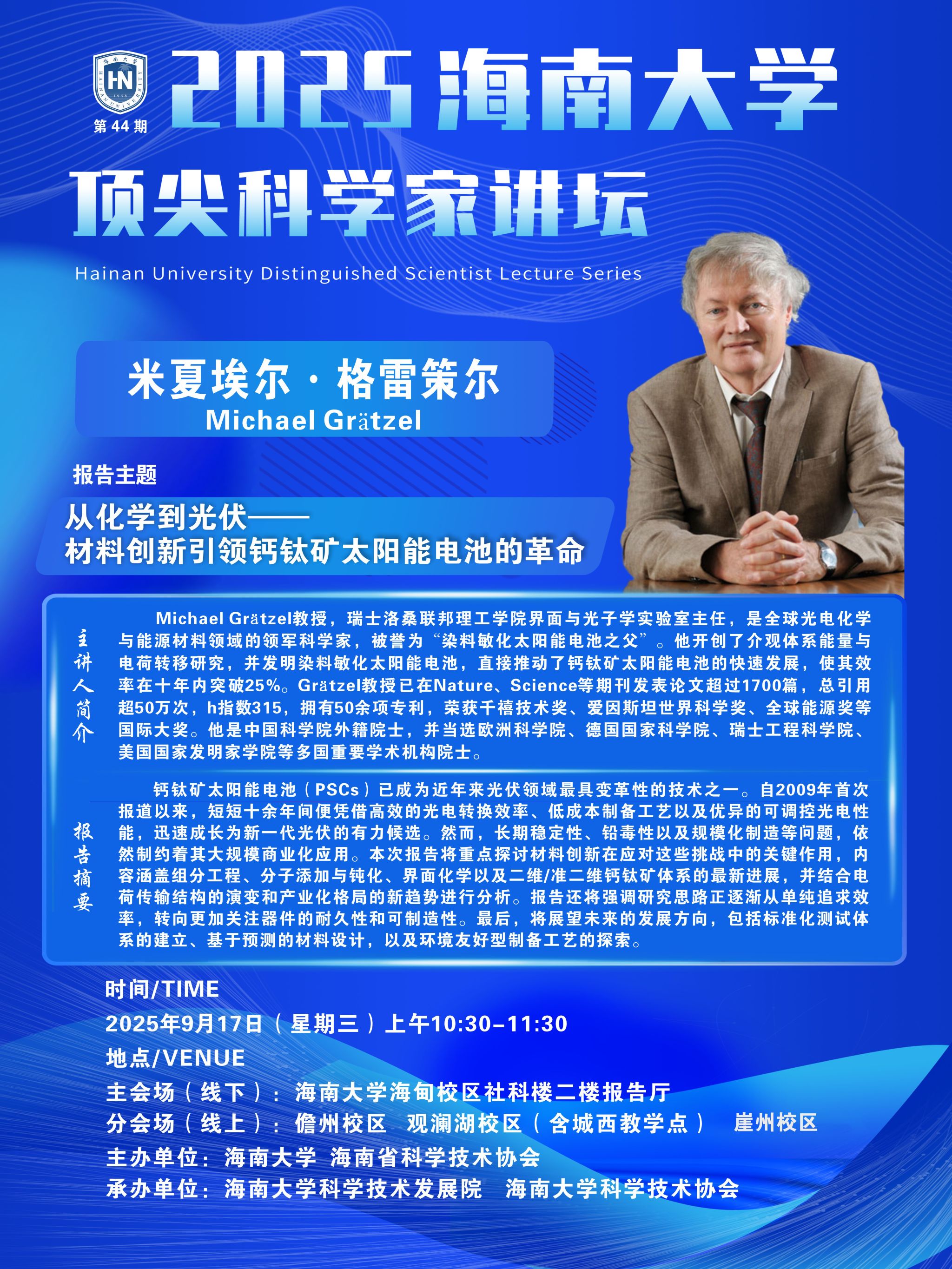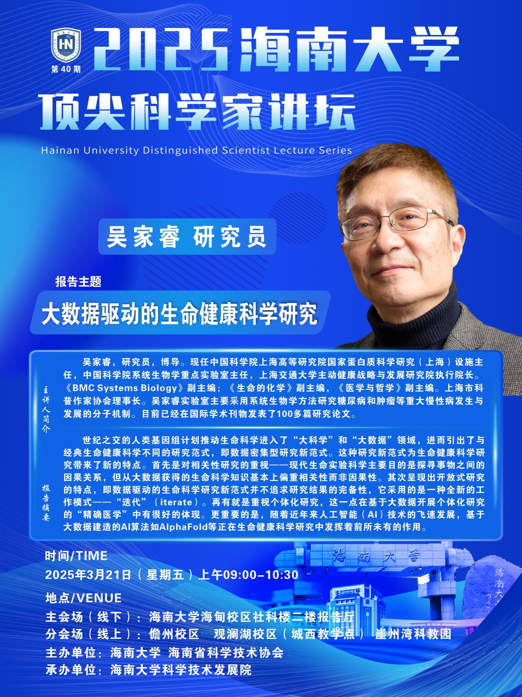 “海南大学顶尖科学家讲坛”致力于开拓学校师生的国际学术视野,增加师生与世界学术大师近距离接触的机会,聆听各学科领域最前沿的声音,促进相关学科国际交流与建设,培养师生的家国情怀、科学兴趣和创新思维,为学校与国际学术界搭建交流的桥梁。